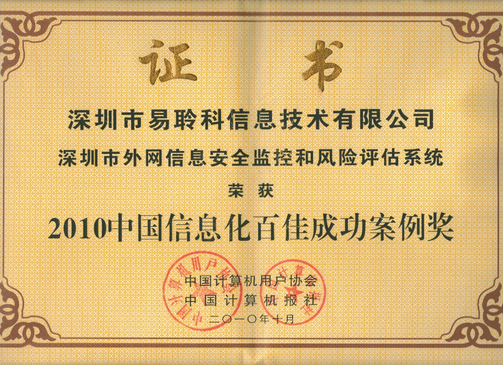 金秋十月,經(jīng)過(guò)二個(gè)多月的緊張?jiān)u審,在眾人期盼下,由中國(guó)計(jì)算機(jī)報(bào)社、中國(guó)計(jì)算機(jī)用戶協(xié)會(huì)聯(lián)合評(píng)選的“2010中國(guó)信息化百佳獎(jiǎng)”獲獎(jiǎng)名單終于揭曉啦!易聆科自主研發(fā)的“安達(dá)防病毒監(jiān)管系統(tǒng)”和“市外網(wǎng)信息安全監(jiān)控和風(fēng)險(xiǎn)評(píng)估系統(tǒng)”分別喜獲“2010中國(guó)信息化百佳用戶推薦獎(jiǎng) ”和“2010中國(guó)信息化百佳成功案例獎(jiǎng)”。本次評(píng)選活動(dòng)是按行業(yè)企業(yè)信息化應(yīng)用的適用、創(chuàng)新、價(jià)值等指標(biāo),經(jīng)活動(dòng)組委會(huì)推薦及專家評(píng)定后產(chǎn)生,產(chǎn)品涵蓋系統(tǒng)軟件、數(shù)據(jù)庫(kù)、ERP等應(yīng)用軟件及網(wǎng)絡(luò)、存儲(chǔ)、服務(wù)器、信息安全和信息終端產(chǎn)品,同時(shí)獲獎(jiǎng)的還有聯(lián)想、惠普、東軟、用友、思科、戴爾、方正等各大知名企業(yè)。
