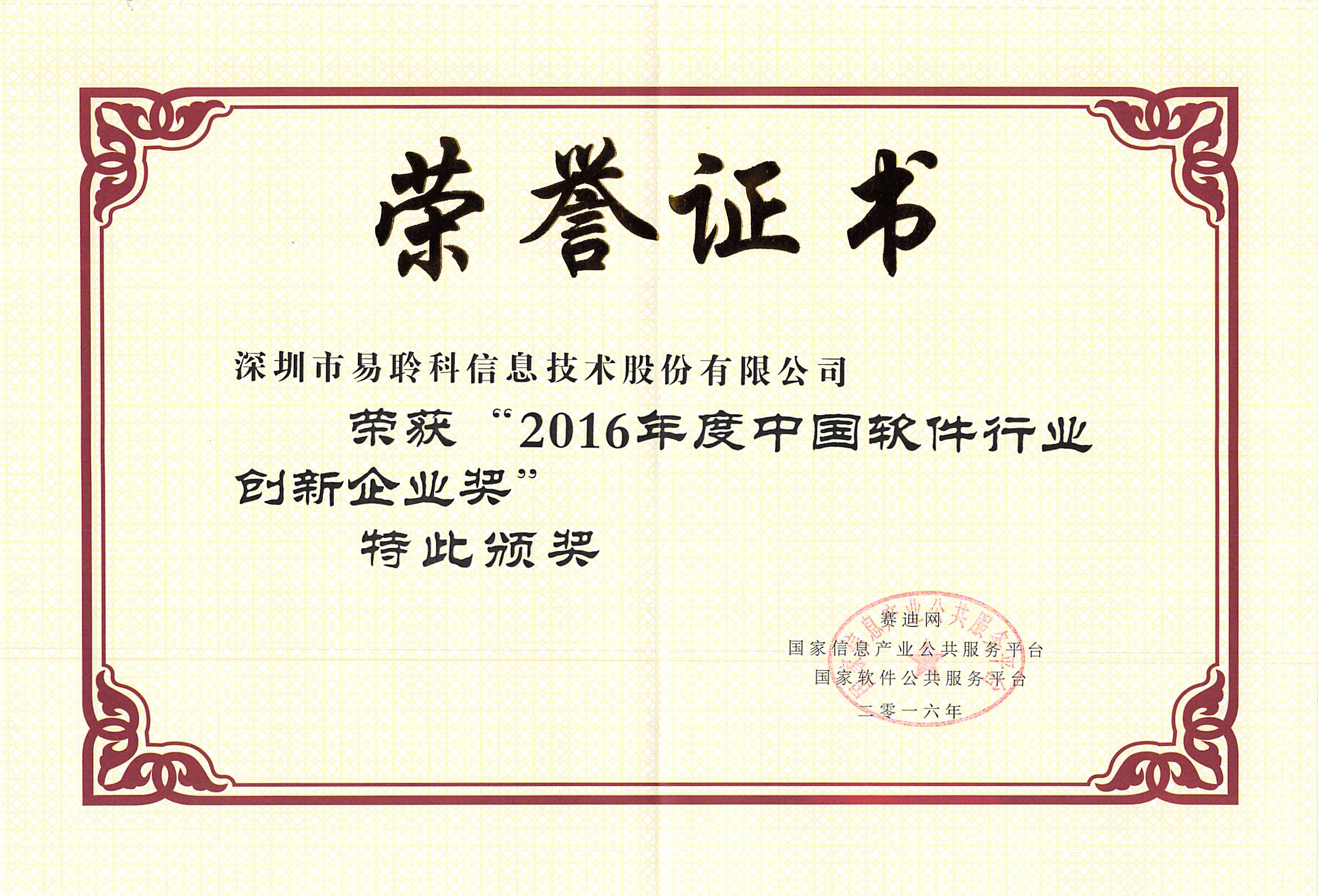 2016年12月16日,易聆科被評選為“2016年度中國軟件行業(yè)創(chuàng)新企業(yè)”,并獲得證書。