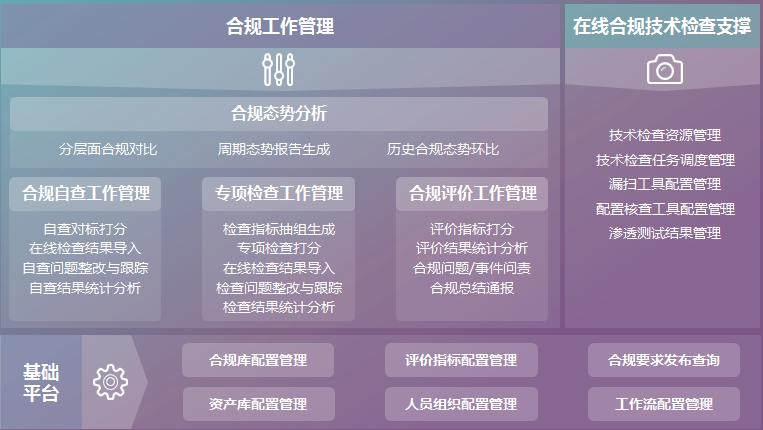 信息安全合規(guī)管理系統(tǒng)是對安全合規(guī)工作全流程及工作要素的整體融合和有效承載,以信息安全合規(guī)庫為核心,通過信息化平臺,將軟件系統(tǒng)運行、體系設計、日常安全運行、安全產品圍繞著安全合規(guī)目標整合為一個有機整體,保障安全合規(guī)目標的有效達成。